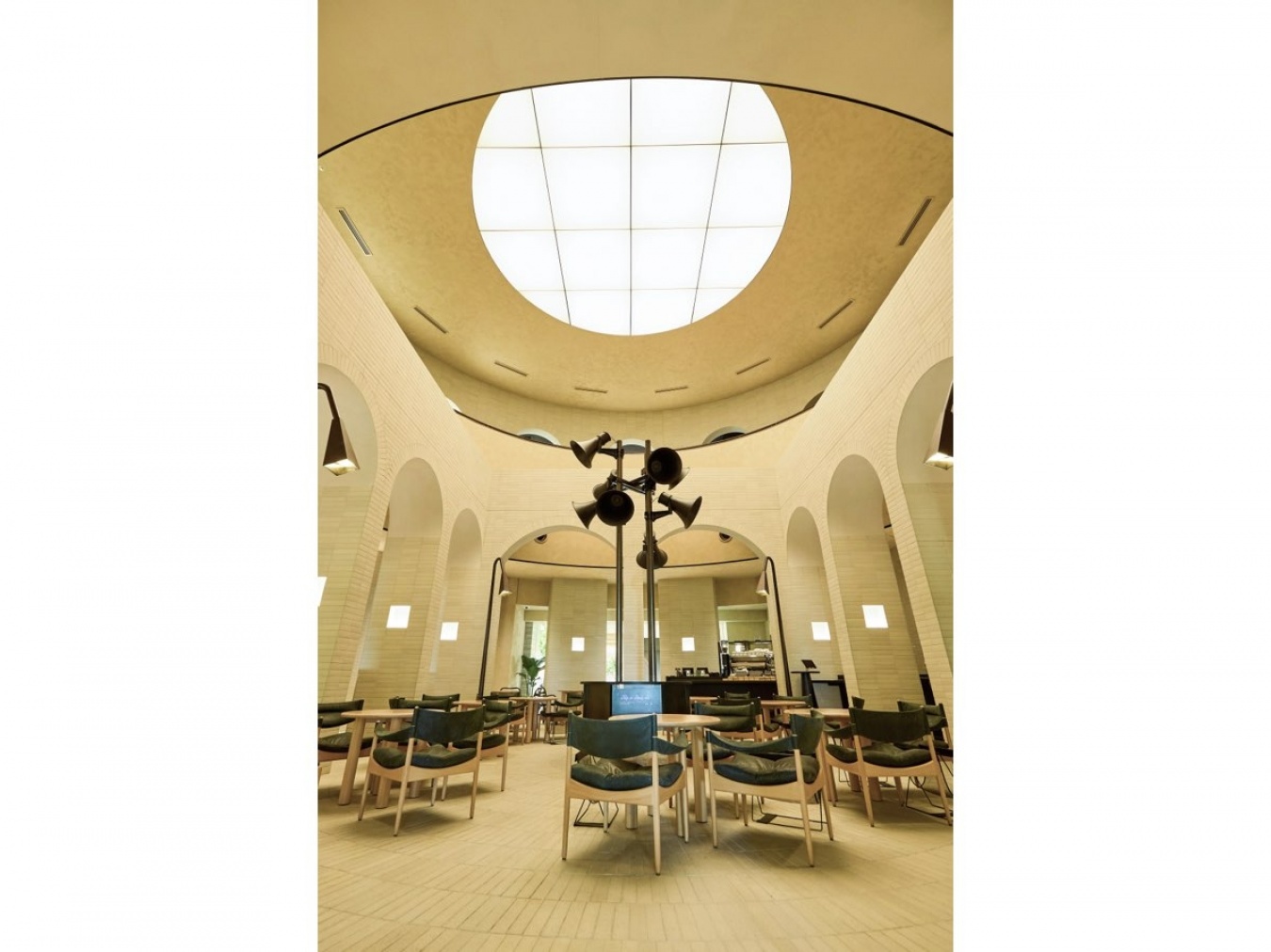 天井には明かり取りの窓を思わせる照明が設けられており、日中は自然光が降り注いでいるようなあしらい。