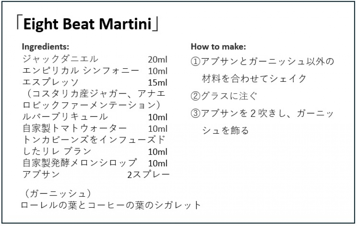 考案したのは、エスプレッソマティーニをジャックダニエルでツイストした「Eight Beat Martini」です。